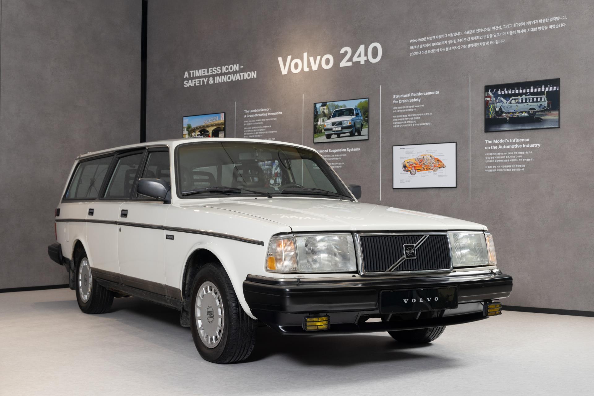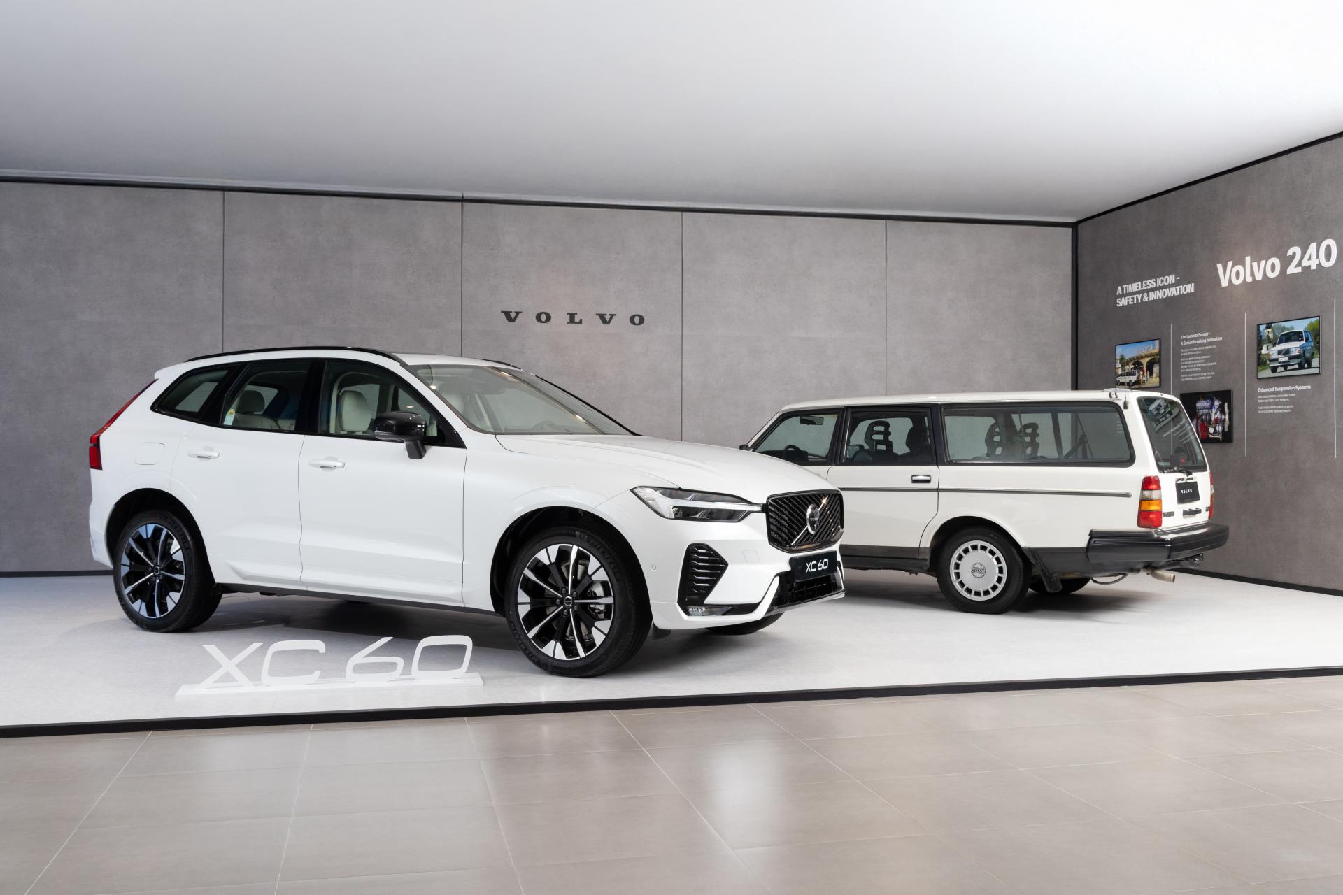 볼보의 역사적인 모델인 240 웨건 클래식 카와 XC60 차량을 함께 전시